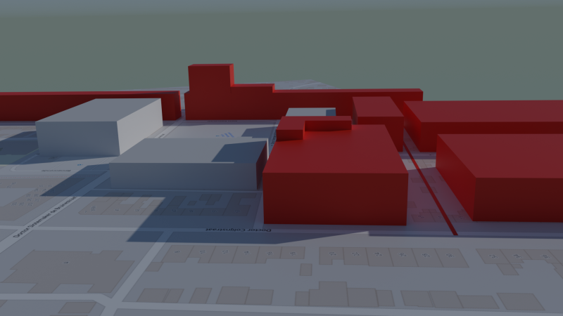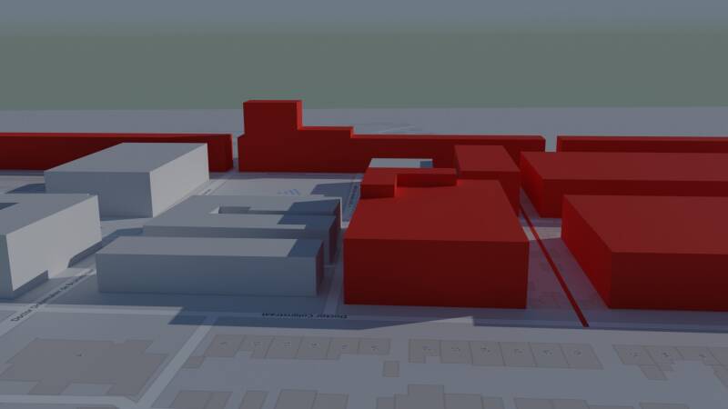Grijs is bestaande bebouwing, Rood is genoemde bebouwing in de stedenbouwkundige voorwaarden.